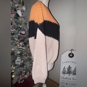 Stay cozy and stylish with this colorblock chevron knit sweater. Featuring a bold design in orange, black, and beige, it's perfect for any casual outing.