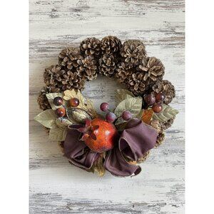 Rustic fall wreaths made of natural pinecones with autumn-themed accents. Each wreath features a rich burgundy ribbon, faux pomegranates, berries, and metallic gold leaves. Perfect for doors, walls, shelves, or holiday tablescapes.