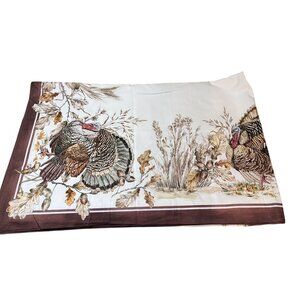Decorate the Thanksgiving table with thoughtful linens artfully depicting turkeys in full plumage within a lush fall landscape.