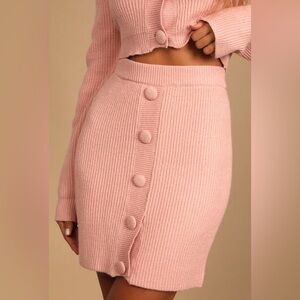 Lulus Exclusive! Enjoy your fave latte as you walk downtown in the Lulus Autumn Scenery Dusty Pink Knit Two-Piece Sweater Mini Dress! Stretchy ribbed knit shapes a slightly cropped cardigan sweater with a V-neckline, long sleeves with puff shoulders, and a functional, fabric-covered button placket. The matching skirt has a high banded waist and a figure-skimming silhouette that boasts three decorative fabric-covered buttons that meet with two functional buttons at the mini hem.