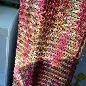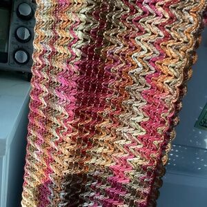 Beautiful autumn colors of burnt orange, red , green and gold , woven together in this scarf with fringe edges in excellent condition. Tag has been removed so fabric and maker is unknown, scarf has a very silky feel to the thread. Measures 31.5 long and 8” wide.