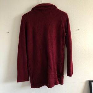 Burgundy jacket, mix of fabric and pleather, gold accents, small tear inside one pocket