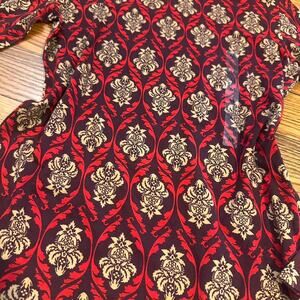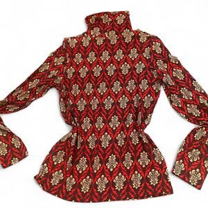 damask print, turtleneck blouse, retro style, long sleeve top, floral pattern, jewel tone, vintage-inspired, fitted, structured, statement shirt