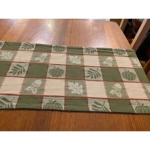 Autumnal Green & Beige Checkered Table Runner 12" x 98" Cotton Blend With Leaf &