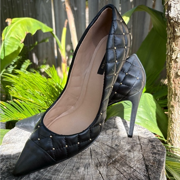 These are Ava & Aiden black leather stiletto pumps, featuring a quilted design and gold stud embellishments