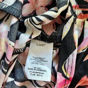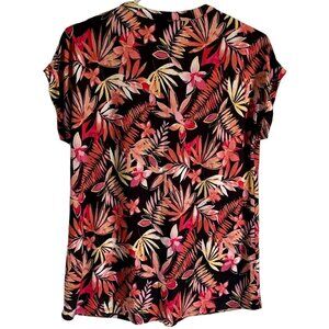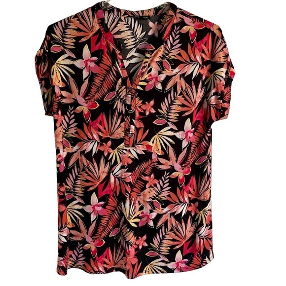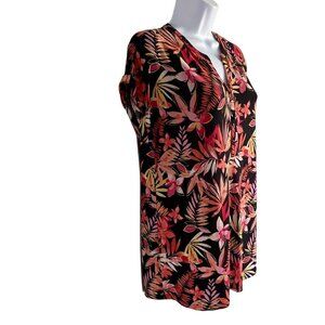 Ava & Grace Short Sleeve Quarter Button Short Sleeve Top, Black with Colorful Floral Pattern. 95% Polyester, 5% Spandex. Women's size Medium with Approximate measurements while laying flat: 19" pit to pit , 27" length.