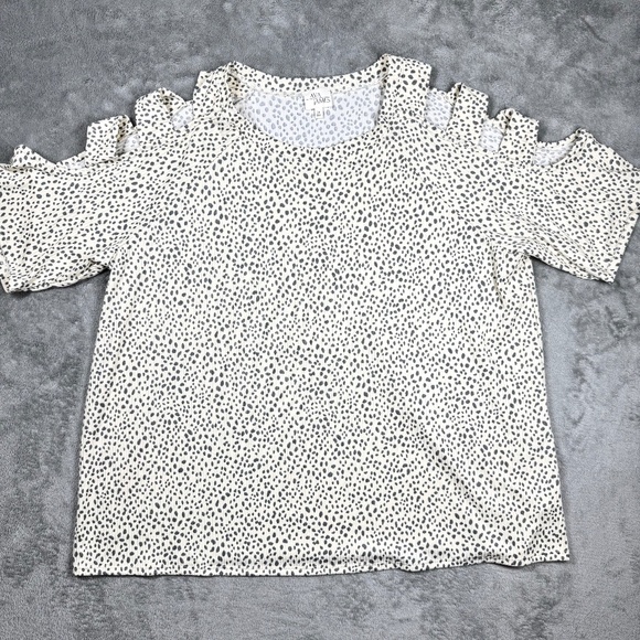 Trendy and flattering Ava James women’s plus size 2X blouse. Features black and white dalmatian-style dot print, cold shoulder cutouts with ladder strap detail, and a comfy stretch knit fabric (96% polyester, 4% spandex). Perfect statement piece for casual wear, work, or a night out. Approx. measurements: • Bust: 24.5” • Length: 28.5” Pre-owned, in great condition. Stylish and versatile, this top pairs easily with jeans, skirts, or leggings for an effortlessly chic look.
