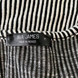 This Ava James sleeveless top in medium size features a black and white stripe pattern. Its smart front tie design and faux buttons add an elegant touch. Made from a blend of polyester, rayon, and spandex, it's new without tags.