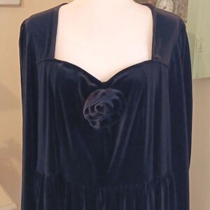 Elegant black velvet dress by Ava & Viv. Sweetheart neckline with a velvet rosette. Long sleeves. Size 2X measures 46 at chest. 42-52 under chest with elastic. Full gathered skirt with pockets. 42 long from shoulder to hem. Perfect for any special occasion.