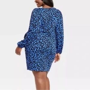 Turn heads in this bold and beautiful plus-size wrap dress from Ava & Viv, new with tags in size 4X. Featuring a vibrant blue and black animal print, this long-sleeve mini dress flatters with a faux-wrap silhouette, side tie detail, and subtle ruching for added shape. The balloon sleeves with elastic cuffs and square neckline add stylish touches while the soft, stretchy fabric keeps you comfy all day (or night). Perfect for date night, parties, or dressing up for brunch!