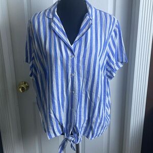 Ava Viv blue and white vertical striped shirt. V-neck. Button front closure. Tie waist. Short sleeves. Extra inside button between top and second button to deepen v a bit more. Sz XXL but to me fits more like an XL. NWOT