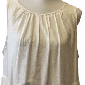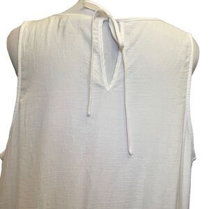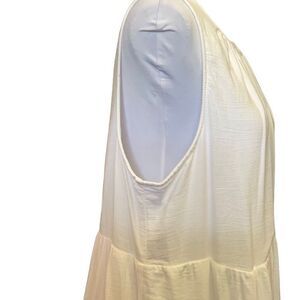 Sleeveless maxi dress with colorblock design. Features white, orange, and red tiers. Perfect for casual outings.