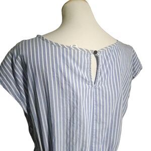 Ava & Viv Shirt Dress. Blue and white striped. Flowy Bell Sleeves. There is embroidered flower detailing on the neckline and bust. An elastic waistline with a functioning drawstring creates a flattering silhouette. high-low hemline, Wide scoop neck, Slit and button closure in back