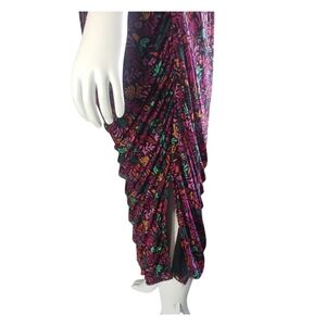 This sleeveless, knee-length dress features a draped design and a cowl neckline. It is in good condition.