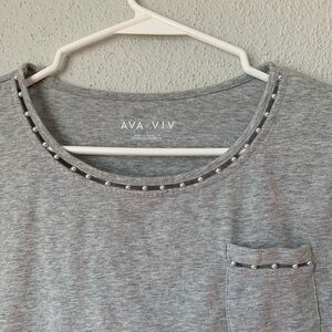 This beautiful blouse is the brand Ava + Viv. Lively neutral gray tee with pockets and a pearl-like stone lining the neckline and pocket ! Super versatile and builadble item, easy to dress up or down. Perfect for date night, a girls night out, church, casual wear, dressier wear, and so much more 😍✨ Size L perfect condition!