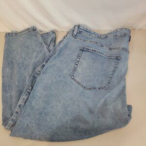 Super comfy jeans with some kind of cool looking "wash" on the front. Also, there's some distress, too. I tried to show the three spots in front (two by the pockets and one and change on the left leg that are "distressed." I liked these because they sat on top of my sneakers and because the high rise slims me down visually. These were bought in the past year and have been really gently loved because I just didn't have much time to be in them before bariatric surgery, so a nice win for whoever gets them next.