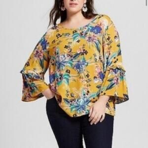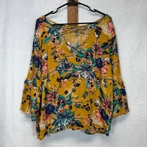 Ava & Viv Mustard Floral Print 3/4 Sleeve Bell Sleeve Strappy Blouse Size 3X