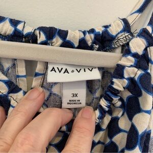 Ava & Viv NWT blue and white geo print linen and rayon blend halter style sundress with pockets and side slit. Elastic knotted waist. Adjustable spaghetti straps with back tie. Size 3X