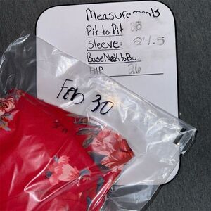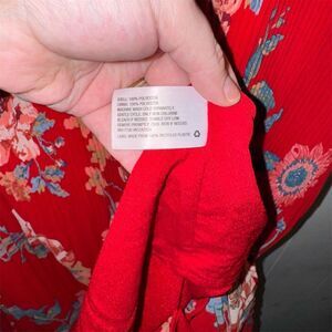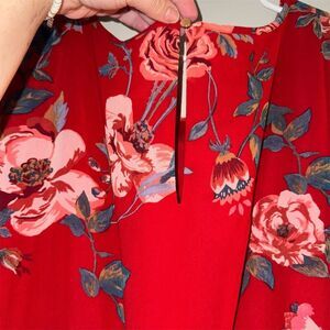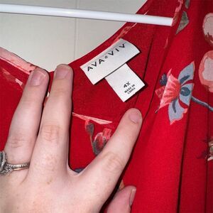 Keywords: Ava & Viv, plus size, cottage core, red floral dress, midi dress, sheer fabric, V-neck, long sleeves, casual dress, garden party, machine washable, pre-owned.