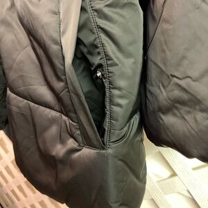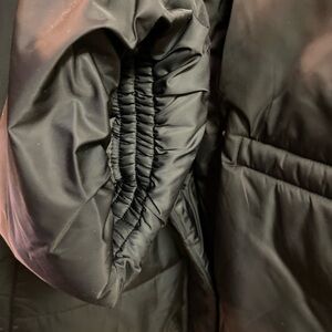 This puffer jacket is made of recycled polyester. The long sleeves does not have a cuff but an elastic band on inside. Drawstring/toggle on inside of jacket at waist.