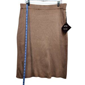 Emanating understated elegance, this Ava & Viv ribbed knit skirt merges timeless design with modern comfort. Designed in a flattering tan hue, it offers a soft texture and versatile wearability. The stretch waistband ensures a comfortable fit, making it an effortless choice for elevating everyday or professional wardrobes. • Ribbed knit texture for added detail • Stretch waistband for comfort and fit • Made with soft, breathable materials • Falls approximately 27 inches in length • Ideal for casual and formal ensembles Top to bottom = 27 inches @2484morales