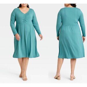 Ava & Viv Teal Ruched Front Long Sleeve A Line Dress