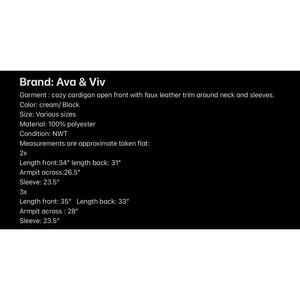 Garment : cozy cardigan open front with faux leather trim around neck and sleeves.