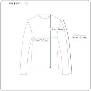 The Ava Viv Women Top in 1X Plus size is a black long sleeve tee made of lightweight rayon and spandex material. It features a V-neckline and a pullover closure, making it suitable for travel or casual occasions. The top offers a regular fit with a solid pattern, casual sleeves, and stretch fabric, making it a versatile addition to any wardrobe for all seasons. This basic T-shirt from Ava & Viv is machine washable and perfect for various seasons.