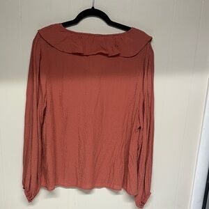 Elegant rust blouse with ruffled neckline. Features long sleeves and button accents. Ideal for any occasion. See all photos as they are part of description