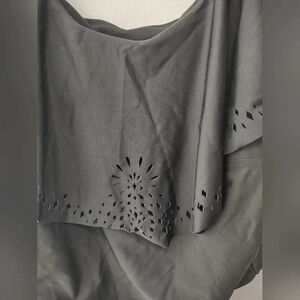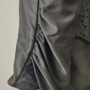 Ava & Viv black one piece swimsuit with stencil cutouts and rouched waist.