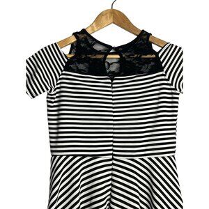 Ava & Yelly Black White Striped Cold-Shoulder Dress Lace Neckline Fit & Flare Si