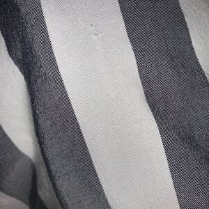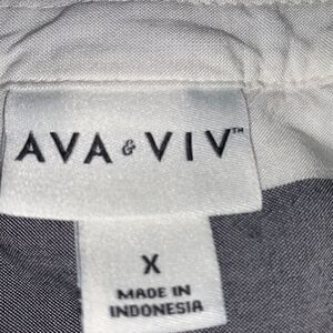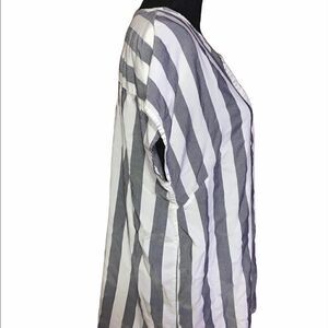 Gray and white short sleeve blouse with v-neck. One hidden front button closure. 100% rayon. Size: X (14W). Preowned in good condition. One small hole on left sleeve and a small on right sleeve (as shown in pictures).