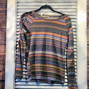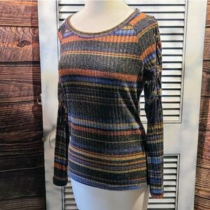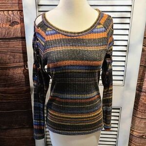 Laced sleeves make this striped top from Available by Angela Fashion unique. Size small. Split cuff hem. Style T101094. 77% polyester, 20% rayon, 3% spandex. Hand wash. Made in China.