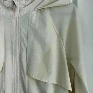 Super cute and stylish jacket that’s perfect for a cool evening in the summer. It has been sitting in my closet and needs to be worn. I have too many jackets. 4 way stretch, adjustable cord, and relaxed fit. 85% Nylon/15% Spandex. It does have a few closet spots as you can see in the photos but they do not take away from the jacket. See pictures for more details.