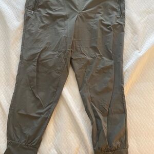 Comfortable olive green track pants. Elastic waistband. Side pocket detail.
