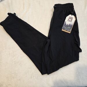 These are a pair of new, with tags, black cargo jogger pants from Avalanche Outdoor Supply Company. The pants are size XS and feature a comfortable, high-waisted design with an elastic waistband and an adjustable drawcord. Made from a blend of 93% polyester and 7% spandex, they offer a relaxed fit and are designed for outdoor activities. The pants have cargo pockets on the legs and adjustable cuffs with a toggle closure for a customizable fit.