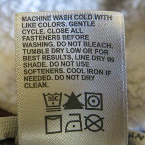 The jacket is in great used condition( used a couple of times) with minimal pilling around the long brown panels. The color is a mixture between dark brown and mottled pink with a geometric design.