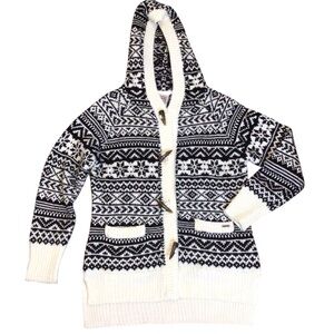 Avalanche Women’s Size M Black White Fair Isle Knit Hooded Toggle Cardigan Sweater.