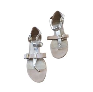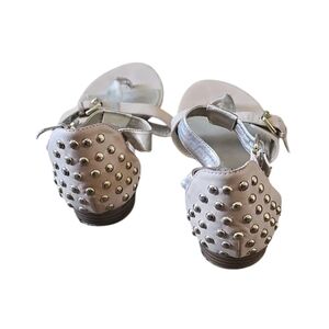 Chic beige sandals featuring stylish studded gold accents. Adjustable buckle strap for a comfortable fit.