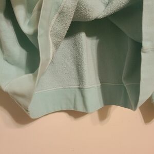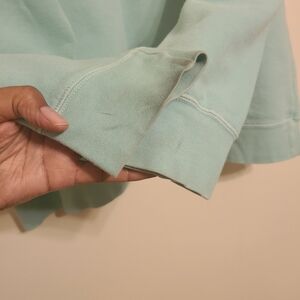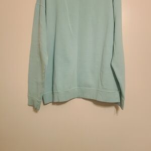 Grab this to put on over your yoga gear or to wear around the house for extra comfort. Women's light or teal green crewneck sweatshirt by Avalon Apparel, size 2XL. Sweatshirt can fit oversized on some. Conway lettering on the front and small side splits. 100% cotton fabric. Excellent pre-owned condition; a small stain on the front of sweatshirt and some markings on back side of sweatshirt. Please see close-up pictures for more details.