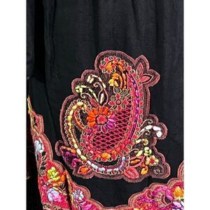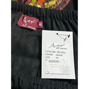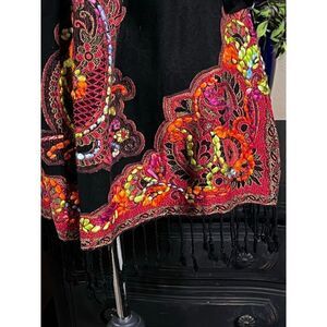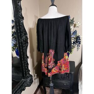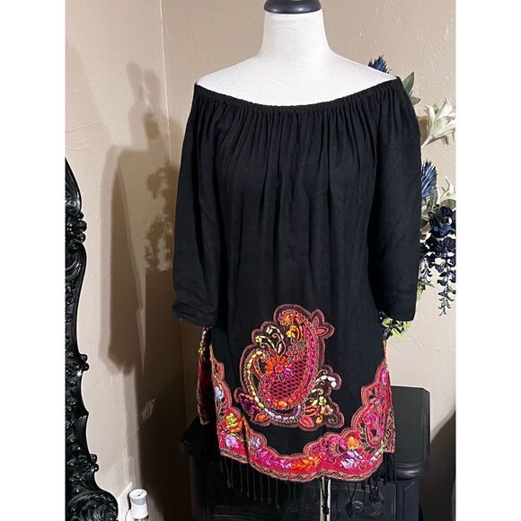 Made of 100% viscose. Features elastic top so that it could be worn off the shoulders or not, beautiful embroidered trim with black fringe, the black fabric on the dress has a paisley in layed design. Laying flat measures 22" from pit to pit and 28" from shoulder to the hem.