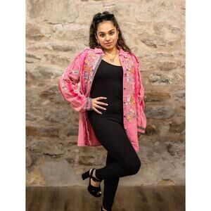 Avani del Amour womens XL pink boho embroidered tunic butterfly open front top
