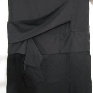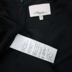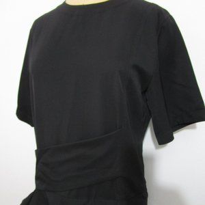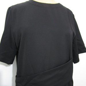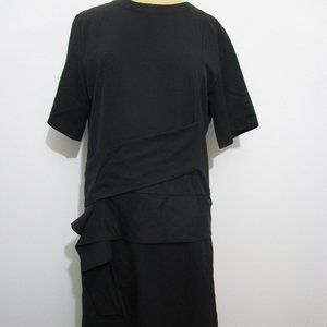 Intricate avant garde black dress from contemporary New York Designer Philip Lim. Easy fit short sleeve with looping loose sash ring and draped pleating. Asymmetrical side pleating in skirt, front and back. 1 side seam pocket and zipper back. Nicely needled with open seaming quality dressmakers detailing.