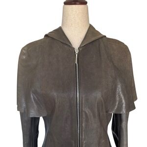 This is a beautiful olive green long sleeve leather hooded zip up leather jacket with caplet and knit cuffs design elements. Side pockets. Back has tail flap style design. No labels or tags but this avant garde design is reminiscent of Rick Owens, Yohji Yamamoto and Ann Demeulemeester. Very well made with Riri zipper which are used by high end brands. The color is an olive green leaning gray. The leather has some slight fading/variation in color and the knit cuffs have safety pins to hold them in place. Best for size small to medium, check measurements.