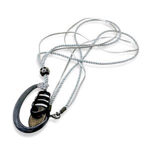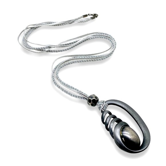 This chic avant-garde pendant necklace is 33 inches long and combines materials that work together harmoniously. It features a sizable modernist abstract pendant crafted from pewter and silver-plated metal. The pendant is anchored by a textured bead on a double cord, composed of silver metallic braided cord and plain gray thread. To ensure security, the necklace is fastened with a reliable lobster clasp, making it perfect for worry-free wear. This versatile jewelry piece brings a distinctive charm to a variety of occasions, from your everyday work outfits to nights out with friends.