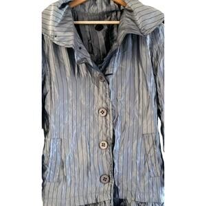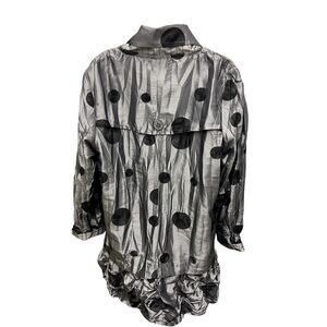It features a bold metallic finish with playful polka dots and eye-catching ruffle detailing. Dramatic avant garde coat with a metallic sheen and bold polka dot pattern. Features a wide lapel collar, double‑breasted button front, pockets and an exaggerated ruched ruffle hem. Lightweight taffeta‑style shell with a soft lining; fits like a modern women’s M. Perfect for goth glam, artwear or statement street style with 80s, 90s and Y2K vibes. Pre‑loved and in good condition with intentional crinkle texture. I ship on Monday, Friday and most Wednesdays. Have a fun time shopping!