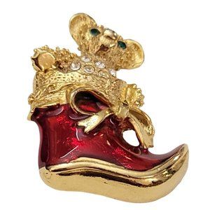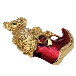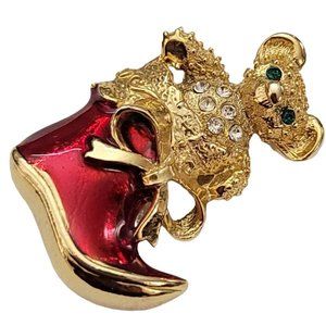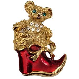 Avante Gold Tone Red Enamel Clear Rhinestone Bear In Christmas Stocking Pin Brooch, Signed K823