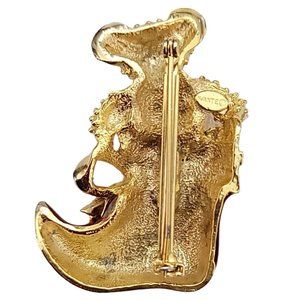This adorable Avante Gold Tone Red Enamel Clear Rhinestone Bear in Stocking Brooch Pin is just in time for the upcoming Christmas Holiday. Affix this pin to your "ugly" Christmas sweater suitable for a Christmas party event. It features a gold-tone bear pin settled inside a Christmas Santa stocking, elegantly decorated with red enamel details, green rhinestone eyes, and brilliant clear rhinestones adorned on the bear's chest. This pin measures approximately 1.9 inches in length, marked AVANTE© on an oval cartouche at the back. Finished with a secure locking pin that functions properly and is in good vintage condition.