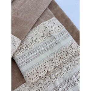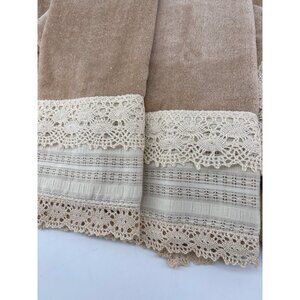 This elegant towel set includes a bath towel, hand towel, and two washcloths, accented with intricate lace trim. Ideal for enhancing bathroom aesthetics.