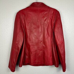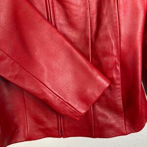 This is a fitted red leather jacket with a sleek, minimalist design. It features a front zip closure, structured seaming for a tailored silhouette, and a classic collar that can be worn folded down or partially zipped for a modern look. The jacket appears to be hip-length with long sleeves and a smooth, slightly glossy finish that adds to its bold, stylish appeal. 100% Leather